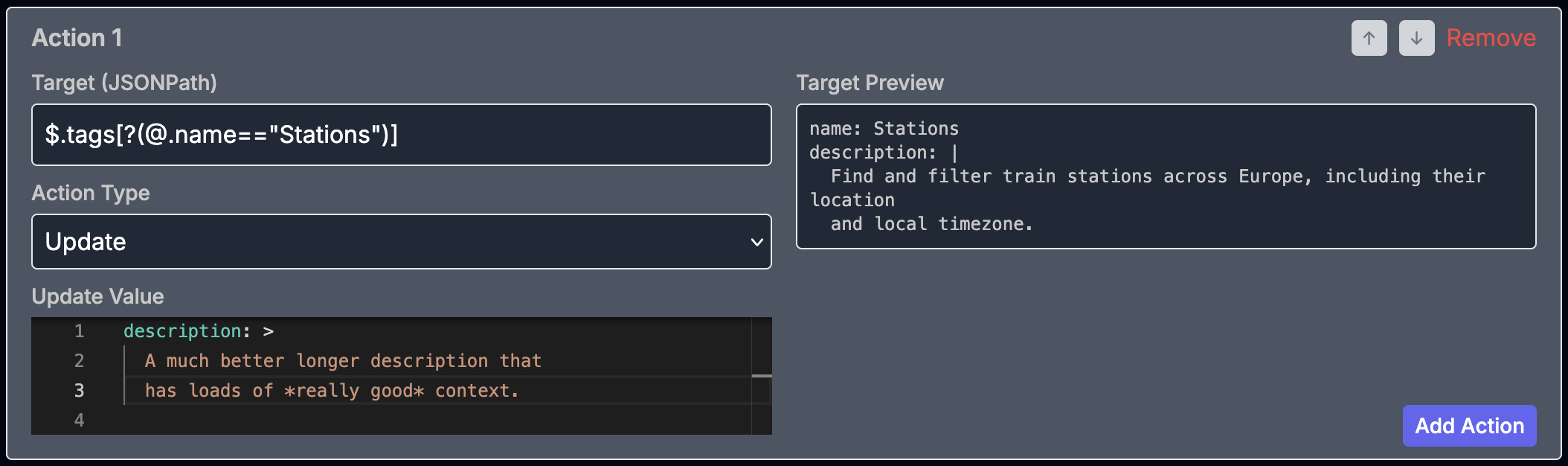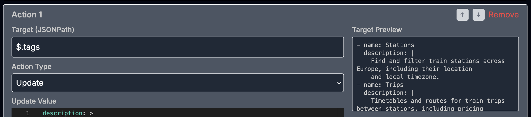 When you type in a JSONPath in the Target field, the Target Preview will update, so you can be certain you are working on the right bit of the OpenAPI document.