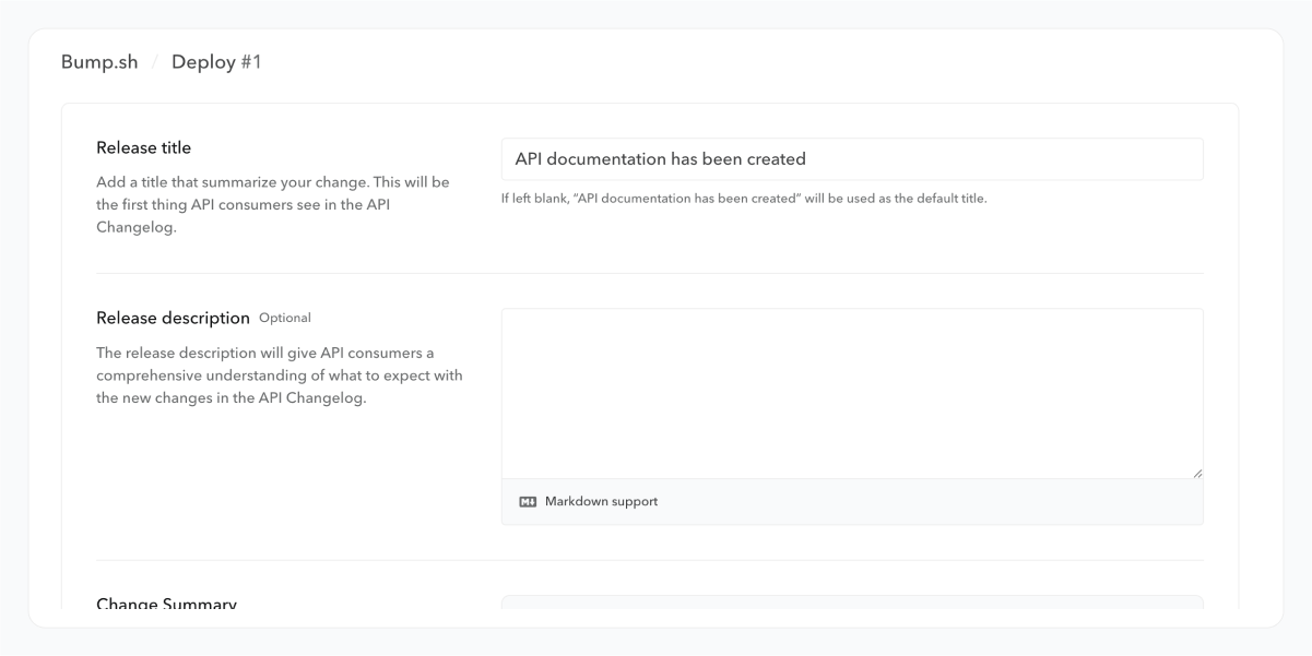 Following this deployment, the new API definition is published to your API consumers. This is what we call a Release: your API documentation is updated, and if your API has changed since the last deployment, a new entry representing this API change is added to your API changelog.