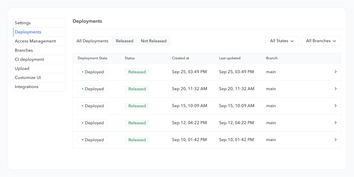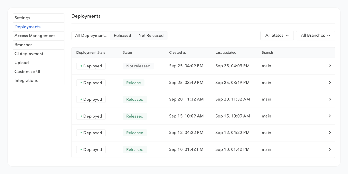 By default, a deployment is automatically released after its processing. However, you can choose to control the release flow by activating the Manual Release setting. In this case, the latest deployments will be enqueued until you decide to release one of them.