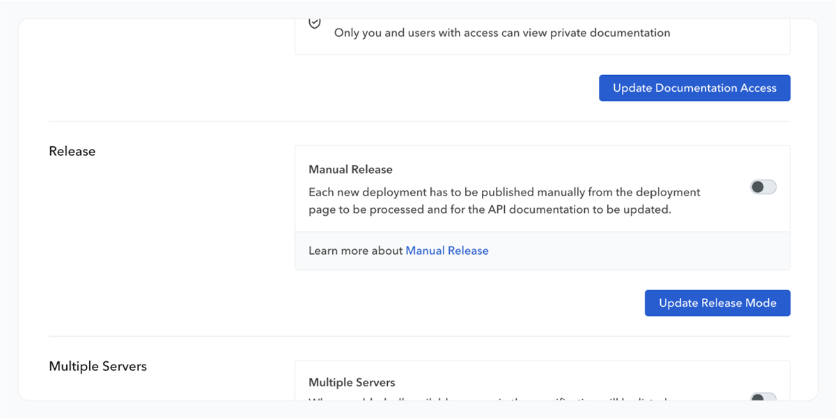 When activated, uploading an API document will no longer automatically release it. We continue to prepare this API definition on our side (and you can view a preview and its future changelog entry), but the release step becomes manual. This means you can decide when to make an API definition live for your API users.