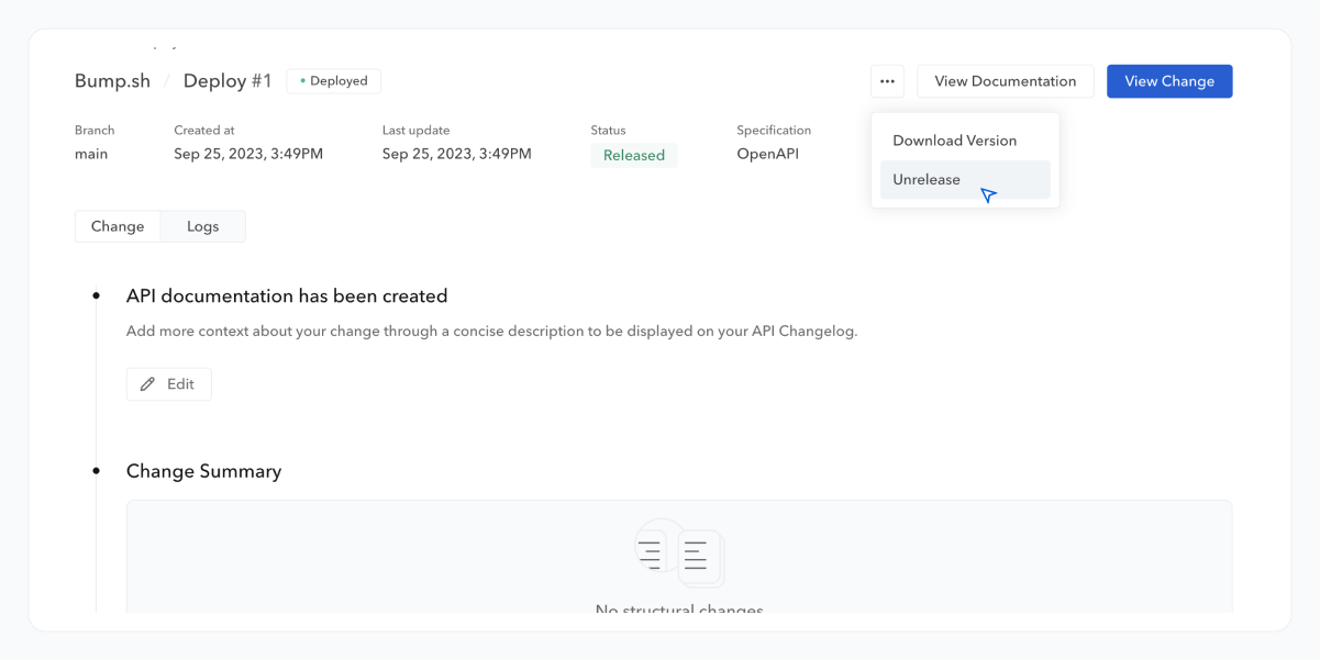 Unreleasing a deployment not only rolls back your API documentation to the previously released one. It also automatically reprocesses its changelog to correctly reflect the changes.