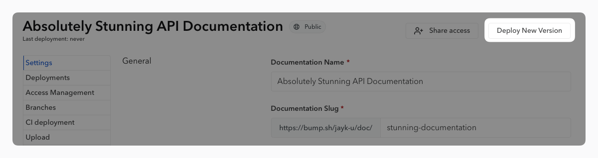To deploy a new API document from the dashboard, you first need to go to the settings of a documentation.